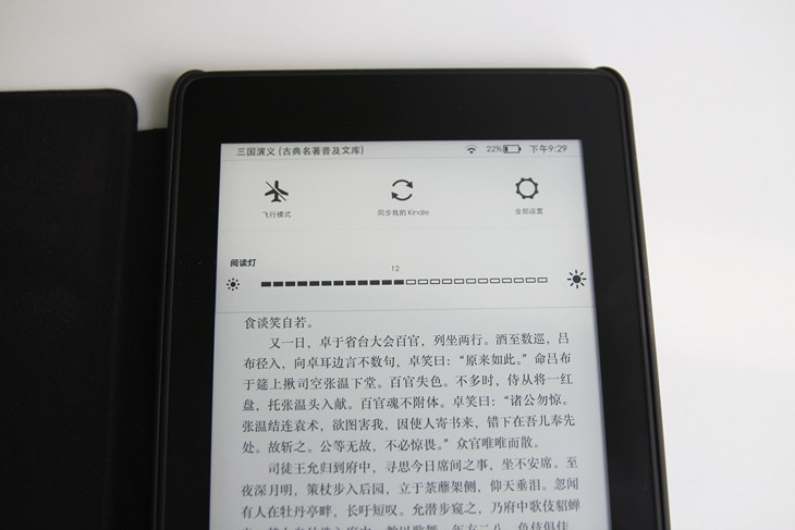 kindle paperwhite的快捷设置非常简便,仅有飞行模式、同步kindle、全部设置以及阅读灯调节四个选项,用户可通过实际光线情况调节适合自己的灯光亮度,本次kindle paperwhite较上一代产品多添加了一枚阅读灯,从四枚增至五枚,光线更加均匀,也更加偏亮一点。