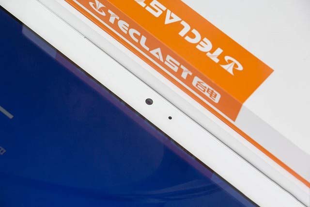 台电t20的正面外观与主流平板还是颇为相似,边框采用了白色,顶部为前置摄像头与光线传感器,用来感知光线自动调节屏幕亮度。