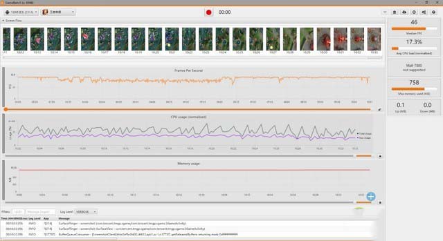 在开启《王者荣耀》默认画质的前提下,我们使用了gamebench来记录它的帧率表现,在十分钟的游戏过程中,它的平均帧率为46帧。
