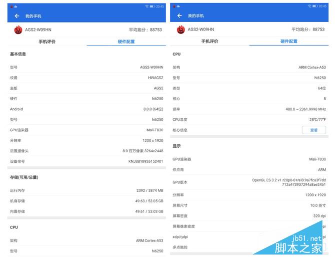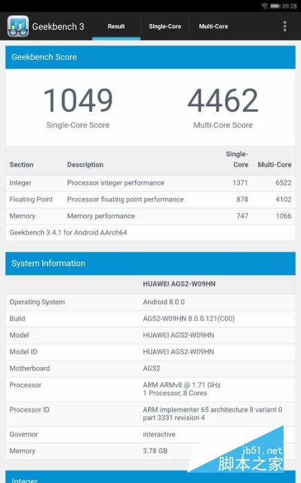 geekbench 3应用检测,单核心成绩1049,多核心成绩4462。进一步验证了其多任务处理方面的能力。所以,非常显而易见的是,这款荣耀平板5能够轻松应对各种应用的流畅运行。