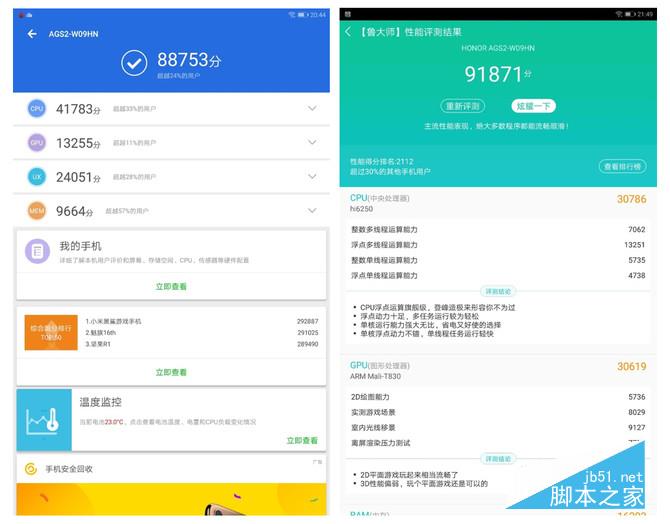综合性能检测方面,安兔兔跑分为88753分,鲁大师评测结果为91871分,可以看到其cpu和gpu在综合表现上都相当不错,尤其是在多线程运算能力方面有着优异的成绩。