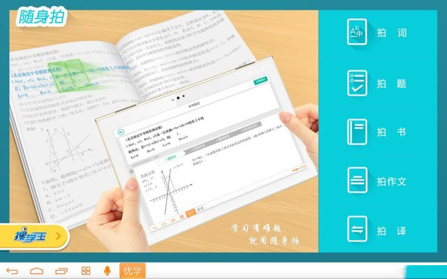 遇到作业难题?用优学派随身拍就能解决!拍题、拍字词、拍书、拍作文、拍译,五大随身拍功能很强大。比如遇到数学难题,孩子可点击“拍题”进入,整页拍,点题搜,不仅能获得清晰的解析,更能反链书本原文知识点,让孩子学会一题,更会一类题,从根本上解决作业难题。