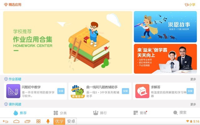 除了前面提到的滤蓝光芯片加多重护眼功能能保护孩子视力,优学安卓双平台将生活和学习有效区分开之外,优学派u27的优学平台还拥有绿色且强大应用生态,它的“优学宝库”,是过滤了不良信息的绿色应用商城,老师要求下载的第三方学习类app均可在其中自由下载。