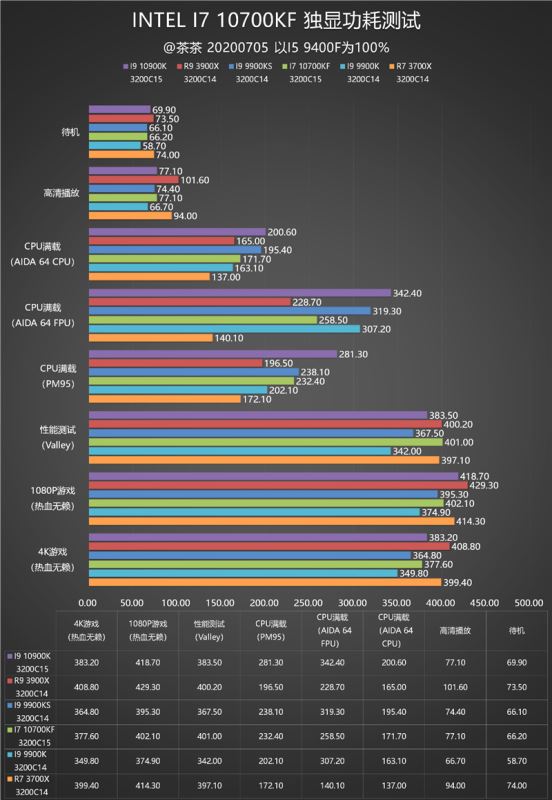 功耗测试只做了搭配独显的平台测试,i7-10700kf的待机功耗与9代i9大致相当,但是cpu满载明显会更低一些。整体上cpu本身最大功耗在155w~175w之间,相比9代i9优化还是很明显的。