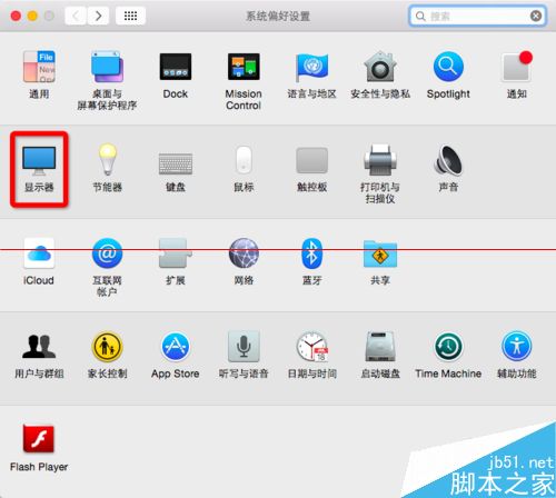 2、在“系统偏好设置”的第二栏点击“显示器”。