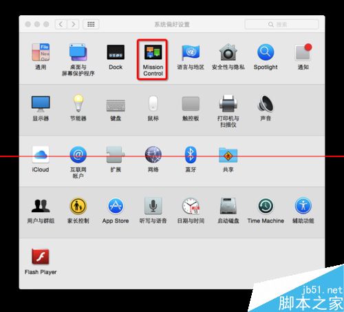 2、在“系统偏好设置”的第一栏点击“mission control”。