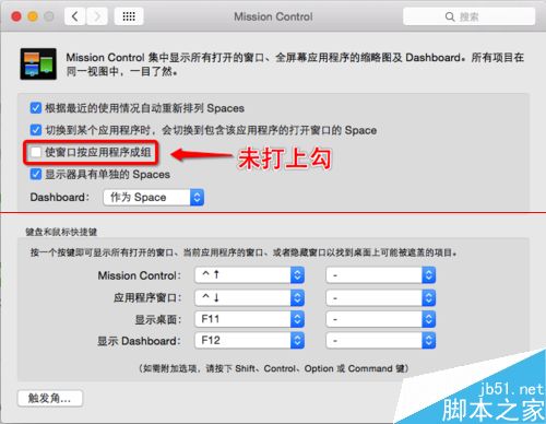 4、如果会出现mission control窗口没有按应用程序成组的情况,那么如图所示的“使窗口按应用程序成组”选项前的钩子是未打上的。