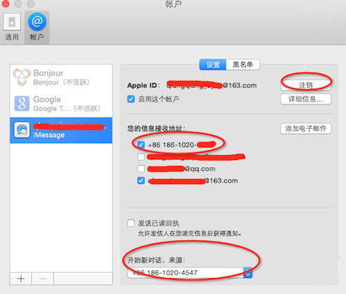 再mac下点击信息 --- 偏好设置---imessages 您接受的信息地址要是你的手机号 和 iphone端设置一致注意 iphone端也要这么设置 默认用手机号然后注销 重新登录即可 :