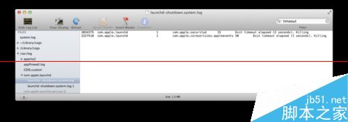 如何找到哪个服务进程退出延迟了呢?这就要看日志了,打开console程序,在左边找到/var/log >> com.apple.launchd >> launchd-shutdown.system.log,之后,在右上角的查找中,输入timeout,就会出现如下图的画面,改图这是我修改之后的截图,在修改之前,两个服务的timeout时间, applevents是20 seconds, securityd是15秒。