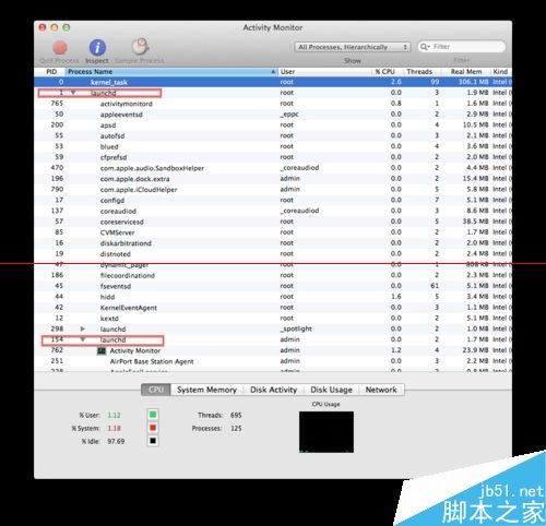 2、现在让我们开启在/applications/utilities目录中的activity monitor程序,选择all process, hierarchically, 如下图,就可以看到各个进程之间的关系。核心总是占用任务id 0的,而第一个launchd总是id 1,用户launchd(下图中的id 154)是id 1的进程子进程。