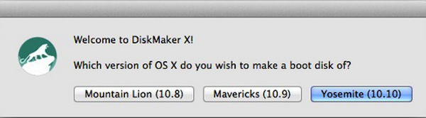 第二步:双击启动 diskmaker x ,第一个界面,软件会询问需要制作哪款系统的安装 u 盘,目前支持10.8、10.9和10.10,选择 yosemite (10.10即可)。