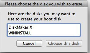 第五步:随后diskmaker x 会列出所有连接至 mac 的驱动器,选择后自己插入的 u 盘即可。注意不要选错,diskmaker x 会格式化 u 盘的。