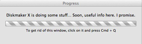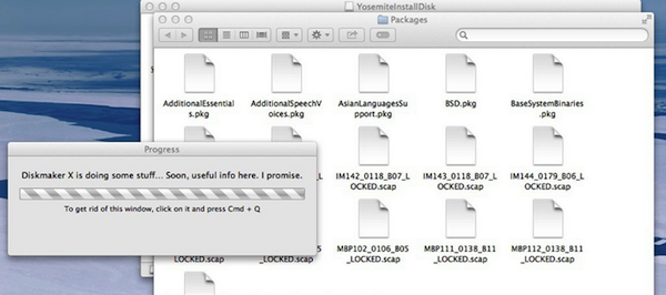 第八步:剩下的就是漫长的等到时间了,diskmaker x 会自动开始 yosemite 安装 u 盘创建过程。创建时间与文件拷贝至 u 盘的速度有关系。只要耐心等待,可以看到diskmaker x 后面会出现窗口并自动复制文件。