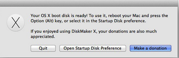 完毕后,diskmaker x 会弹出提示,这时我们可以重启 mac 并按住 option 按钮,并选择刚刚制作完成的 yosemite 安装 u 盘。