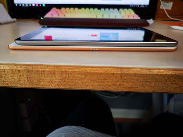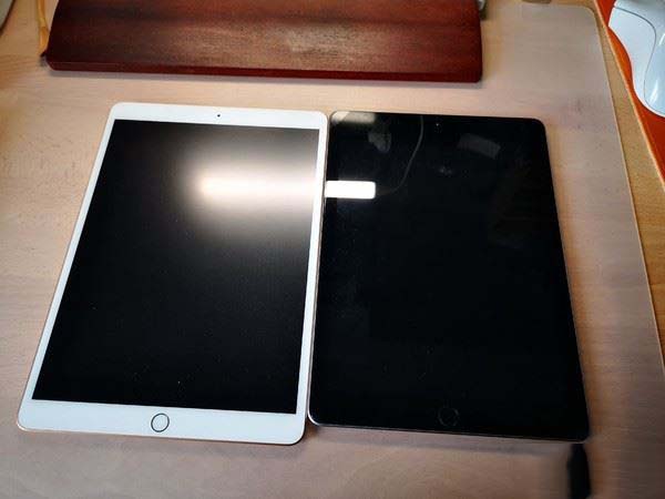 点亮屏幕,可见10.5显示区域看着大一些,也舒服一些,左右边框窄一些看着也挺舒服的。拍这张屏幕照的时候已经贴膜,左边air是类纸模,右边2018是高清膜。