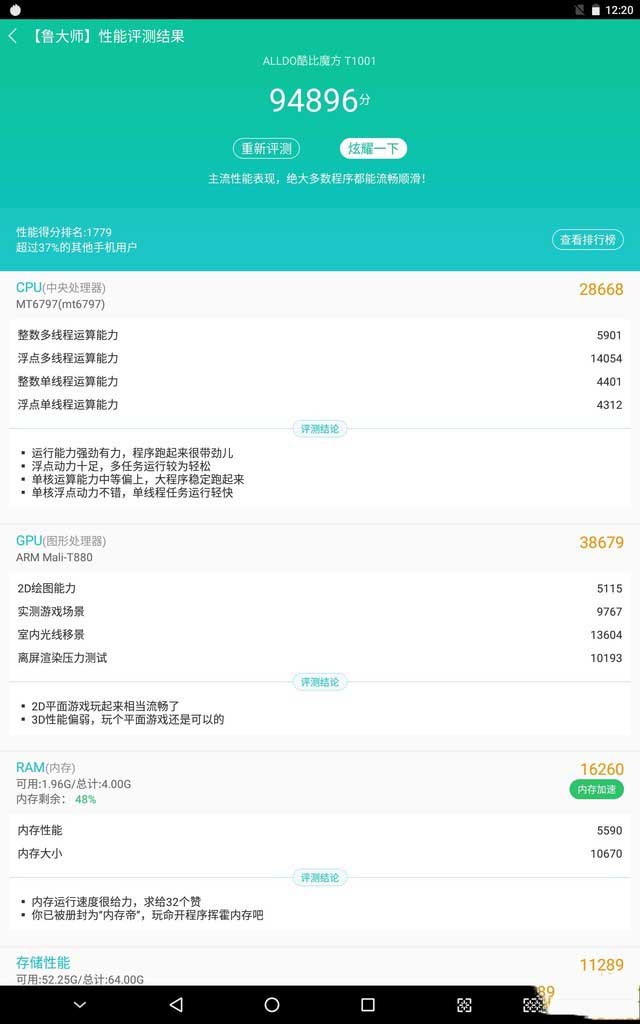 使用安兔兔v7.1.401对酷比魔方x1进行了跑分测试,结果如下。