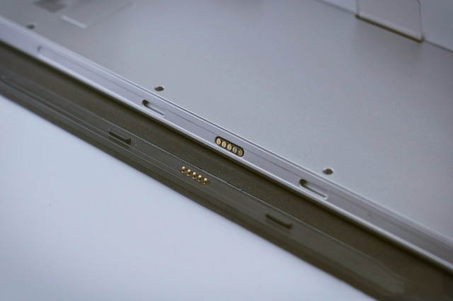 平板与键盘的连接采用了磁吸+物理卡锁的方式,十触点加上两个突出的金属卡锁,连接紧密,即便是在颠簸的路途中使用也不会轻易分离。键盘并非是无线蓝牙的链接方式,属于磁吸直连,因此避免了充电带来的麻烦。