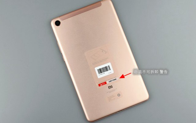 小米平板4后盖怎么打开?首先,小米平板4是不支持打开后盖的,这在我们开箱后,在平板背面可以看到一个“后盖不可拆卸”的警告。如果自行拆卸后盖,可能会面临失去免费一年保修服务。