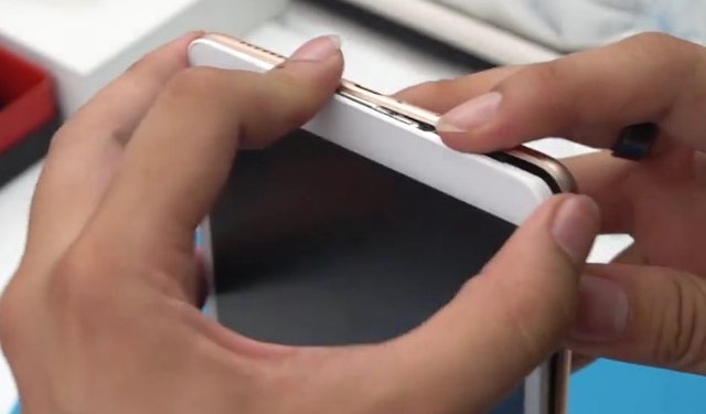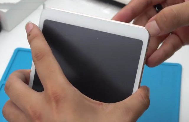 对于没有吸盘和拨片工具的用户,也可以用手徒手分离后盖,不过难度比较大,要是能借助拨片会更方便一些。具体操作是,首先使用指甲找到一个缺口,然后划开,如下图所示。