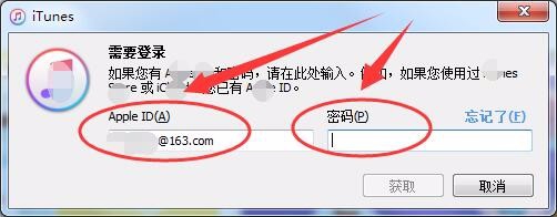 8、在出现的对话框中,输入本苹果机的帐号和密码,单击获取按钮。