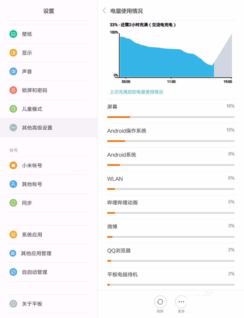 2、耗电续航方面:小米平板3的电池容量要比小米平板2的增加了一些,并且小编进行了测试,耗电方面没有太大的改进。左图为小米平板3,右图为小米平板2