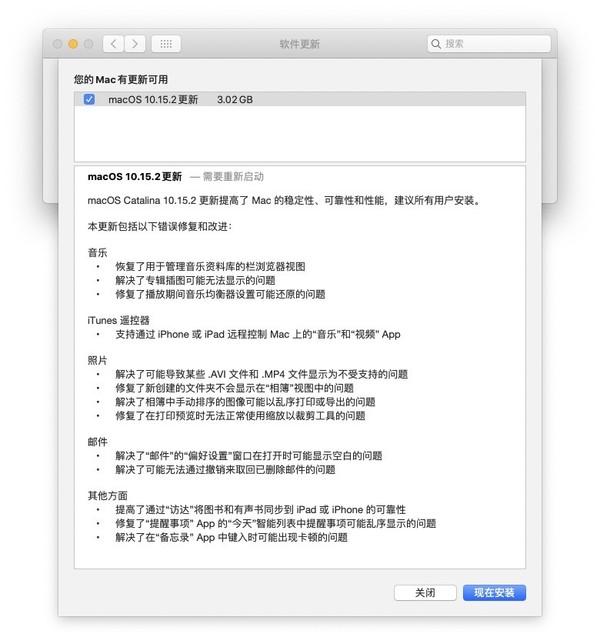 从更新信息来看,此次macos catalina 10.15.2主要是更新提高了mac的稳定性、可靠性和性能,并且修复了“一箩筐”的小问题。安装包大小为3.02gb,是一次大更新。作为全新的mac操作系统,macos catalina发布也有了一段日子,相较上个大版本在稳定性上有了很大提升。