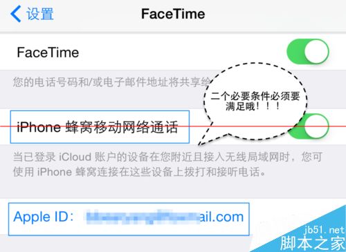 3、接着还需要在 iphone 上的“设置-facetime”里用我们的 apple id 来打开 facetime 功能,并且还需要在 iphone 上打开“iphone 蜂窝移动网络通话”这个选项,它是让 iphone 与 mac 结合的必要条件。