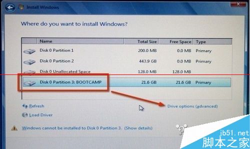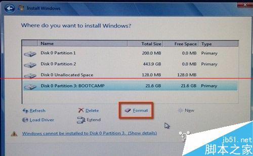 2、分区完之后根据boot camp助理提示,插入系统安装光盘。系统识别光盘之后重启。重启后,自动进入windows安装界面,之后和一般装系统流程差不多。选中分出来的boot camp分区直接格式化,不要删除。选择ntfs格式,兼容性更好。格式化完之后直接安装。