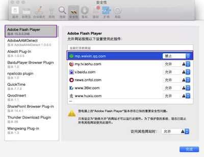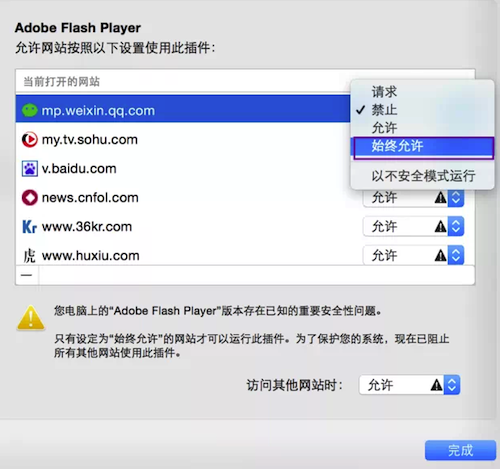 这也就意味着,用户无法通过safari观看flash内容。用户在使用safari浏览器访问flash内容的时候,会看到插件已拦截、flash安全警告、flash过期等提示信息。当然很多用户也确实需要使用flash插件,比如微信公众平台上传图片,看优酷等等,下载其他浏览器可以使用,但是我习惯safari,其实简单设置下还是可以使用的。苹果还会要求用户下载新版本的flash player,但事实上,adobe并未发布任何更新,所以用户要么放弃观看flash,要么冒着安全风险进行。