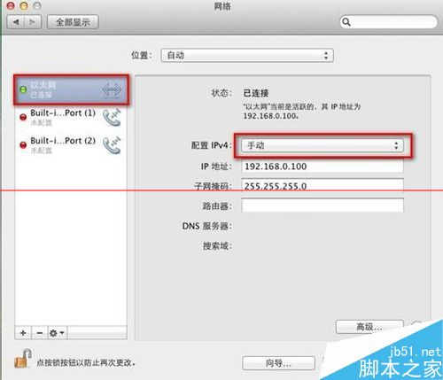6、第四步 将打印服务器按照预订的使用拓扑与打印机和路由器连接好,将您的mac电脑的ip地址改回之前的数值,例如配置ipv4改为使用dhcp或者手动指定为原来的ip地址。