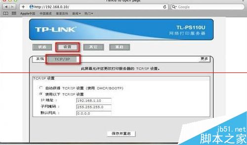 5、第三步 打开系统浏览器safari,输入http://192.168.0.10回车进入打印服务器的管理界面,选择设置--tcp/ip,修改打印服务器的ip地址后点击保存并重启。
