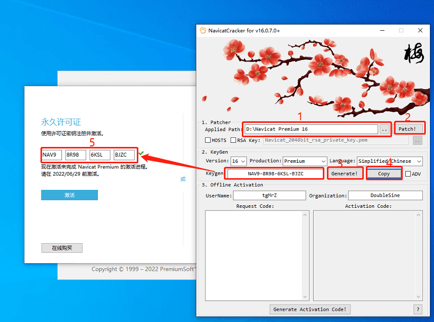 点击【generate activation code】;将生成的【激活码】复制到navicat中;点击【激活】