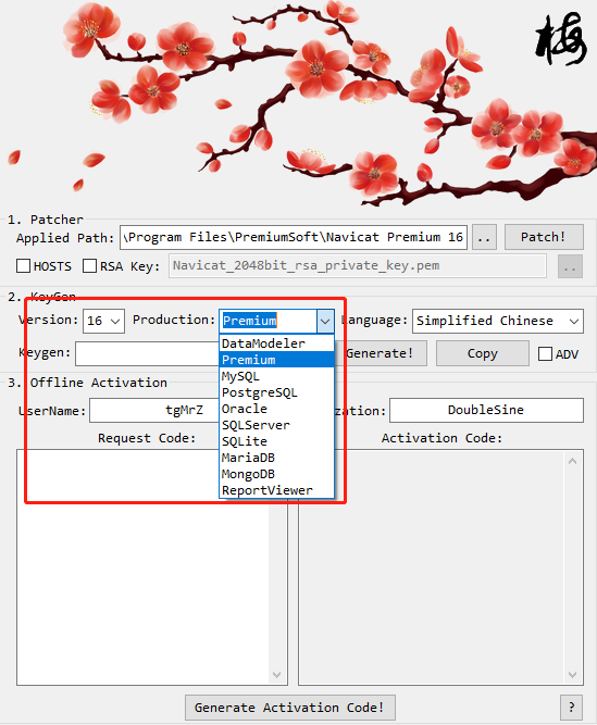 - 1.核对激活工具中【version】【production】选项是否和您本机安装的navicat版本一致,默认为【16】【premium】;上述教程在本机安装【navicat premium16】环境下进行