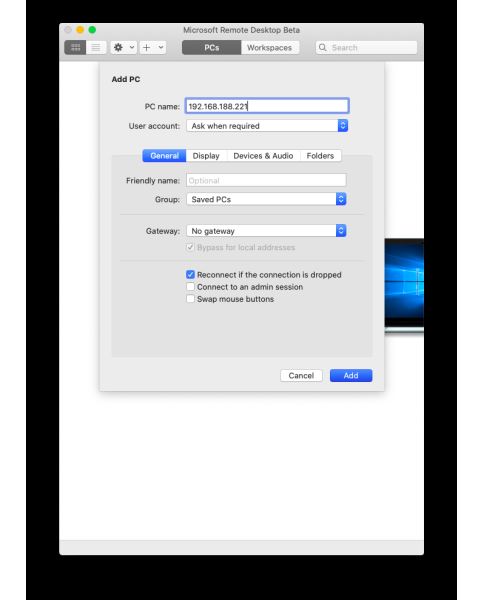 此时我们在 mac 上打开我们刚才下载的 microsoft-remote-desktop-for-mac 点击 add pc 填上 windows 电脑的是 ip地址,我这里是 192.168.188.221 你可以打开控制面板—网络和 internet —网络和共享中心— wlan —详细信息— ipv4 地址,或者 win键+r 输入 ipconfig 回车即可看到当前 ipv4 地址。