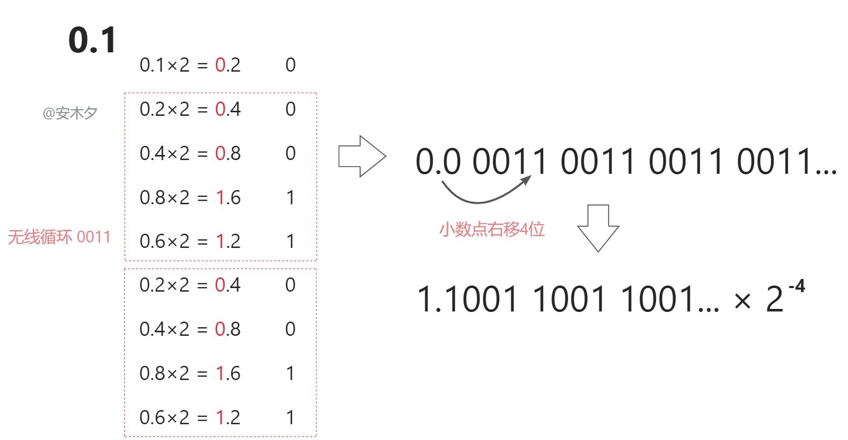 二进制无法准确表示小数0.1,是因为0.1 转换为二进制后是无限循环的,0.0 0011 0011 0011...,“0011”无限循环。就像十进制小数1/3 = 0.333 一样。
