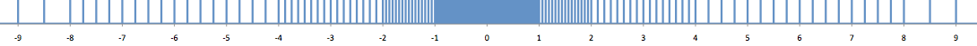 32位float 用了23位来存储有效数字,十进制也就6~7位(2^23=8388608 )。在ieee754规范中,小数的“刻度”并不是均匀分布的,而是越来越大,数值越大则精度越低。如下面的表盘和刻度尺的示意图,其精度(gap)的分布是不均匀的,0附近数字的精度最高,然后精度就越来越低了,低到超过1。