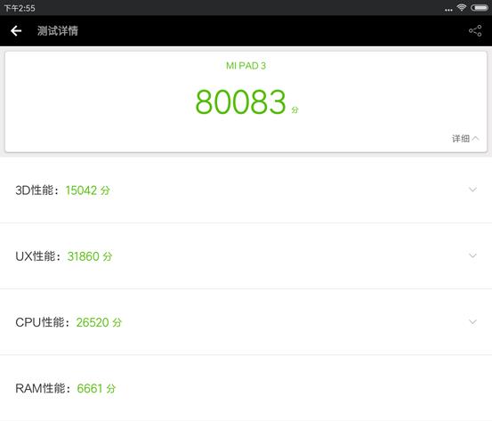 在跑分方面,本次小米平板3搭载的mt8176在安兔兔测试中跑出了8万的分数,与骁龙652平台的跑分接近,而相较于小米平板2的5万+的成绩有很大的提升。这样的分数并不算高,但实际操作体验中它的表现令人满意,没有出现卡顿;而且即使在跑分这样的压力测试下,小米平板3的发热控制的仍然很好,和跑分之前并无大异。