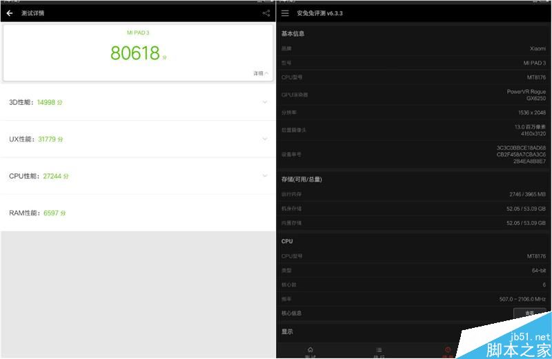 在跑分测试中,小米平板 3 在安兔兔中可以跑出 8 万分左右,和骁龙 650 基本相同,略低于骁龙 653。