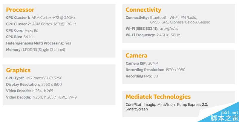 cpu方面,mt8176拥有2个cortex a72 核心(最高主频 2.1 ghz)以及 4 个 cortex a53 核心,gpu 为imaginationtechnologies 的 powervr gx6250(主频 600 mhz),支持4k h.265视频的解码,台积电 8nm hpm制程。