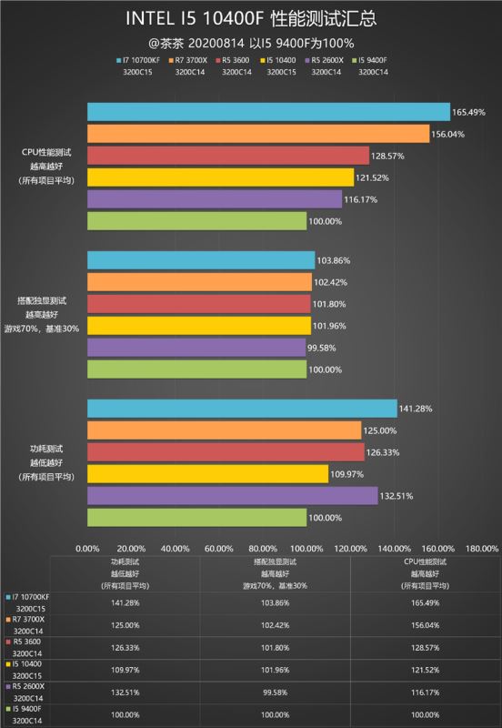 - 就cpu的综合性能而言,i5-10400f大致介于锐龙5 2600x和锐龙5 3600之间。与i5-9400f相比提升了超过20%,从intel自身来看其实提升幅度并不小。