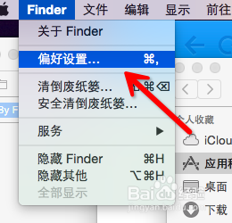 2、然后一次选择finder,选择偏好设置。如图所示。