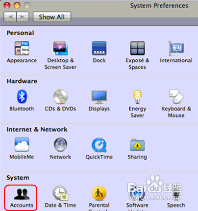 1、苹果图标打开“系统偏好(system preferences)”,点击“系统(system)”中的“帐户(accounts)”: