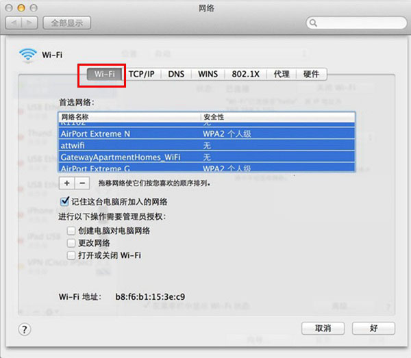4、点击“首选网络”,按command-a全选,然后点击“delete”删除所有的备选连接