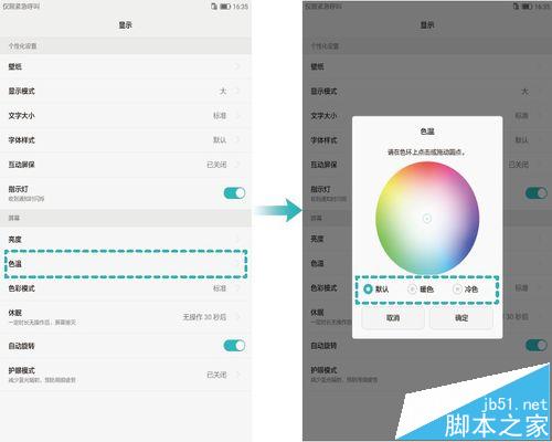 3、打开【设置】,点击【显示】>【色温】,各位小主可以看到有三种直接可供选择的色温模式,即【默认】、【暖色】、【冷色】,根据周围环境及实际情况,选择需要的色温模式,然后点击【确认】即可。除了以上三种,还有一个色环,可在色环上直接点击或者拖动圆点到自己认为看着舒服的色温模式,点击【确认】即可。