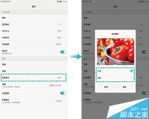 2、平时屏幕色彩默认为标准模式,当您观看视频,浏览照片等对屏幕色彩要求较高时,可以选择鲜艳模式,在保证色彩不失真的情况下争取最大饱和度显示~