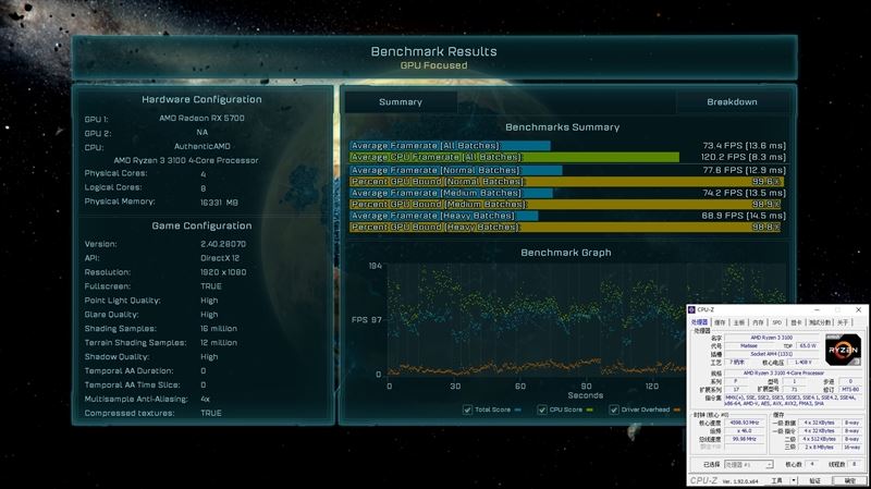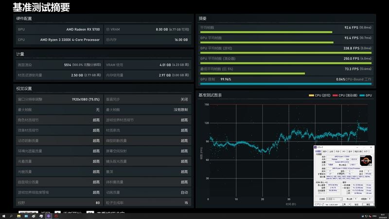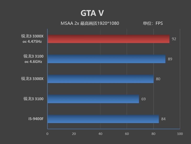超频到4.475ghz的锐龙3 3300x帧率略微提升到了92.6fps。
