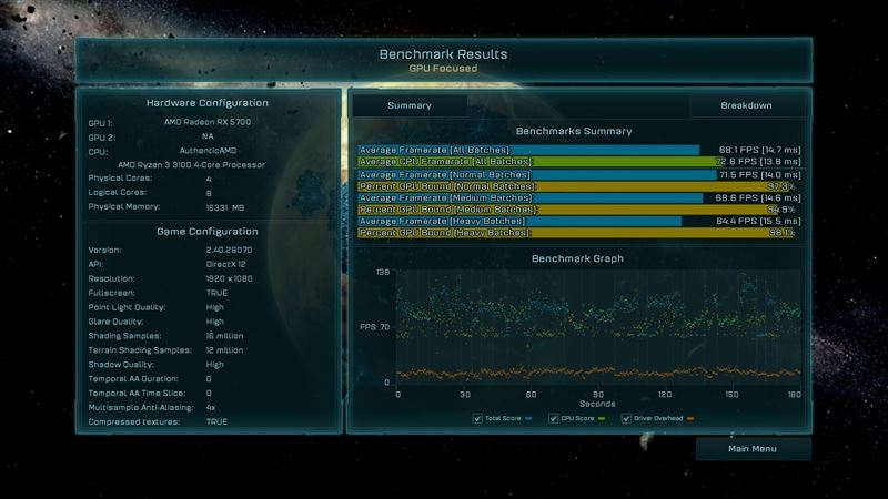 在默频下,锐龙3 3100的帧率比较低,不过超频之后提升幅度达到了12%。而在搭配锐龙rx 5700时,锐龙3 3300x已经不是系统瓶颈所在,在超频之后帧率只提升了3fps。