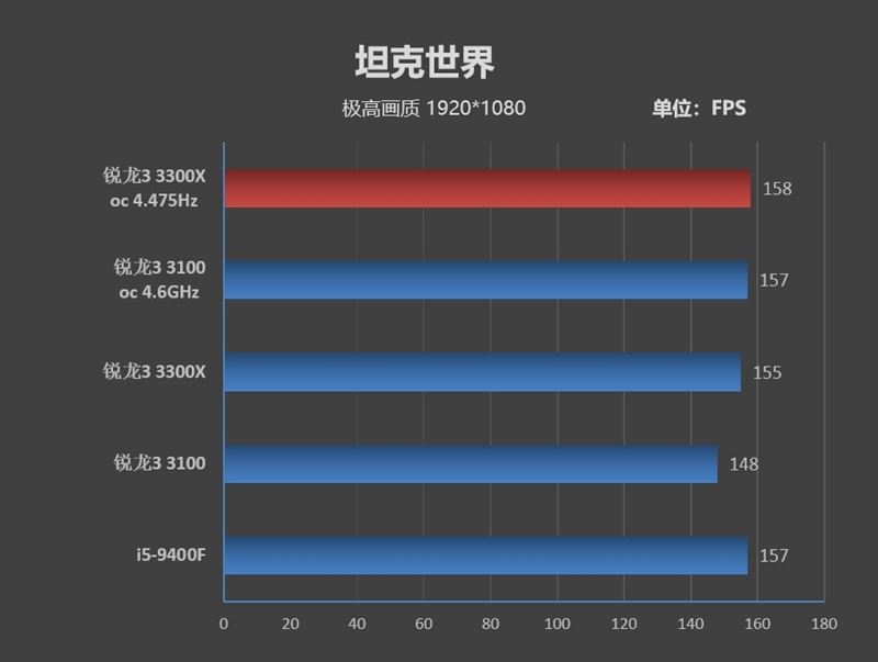 除了默频时的锐龙3 3100帧率略低之后,其他3款处理器的成绩不超过3fps。