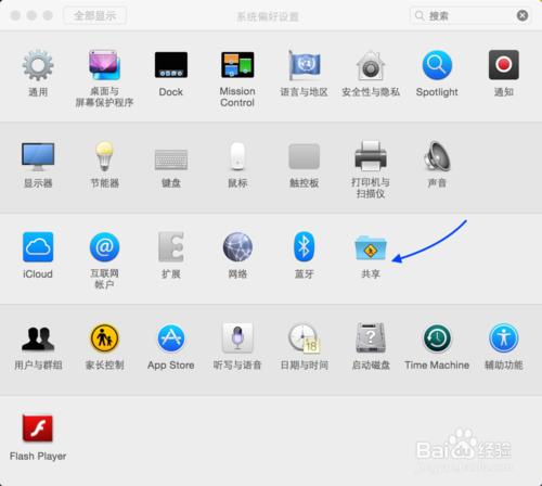 随后请在系统偏好设置窗口中点击打开“共享”功能,如图所示