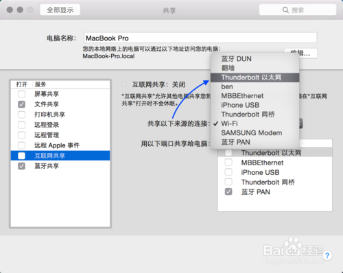 随后请点击共享以下来源的连接的下拉列表,选择我们想要共享出去的网络接口。我当前是想要共享的是 thunderbolt 以太网有线网,如图所示